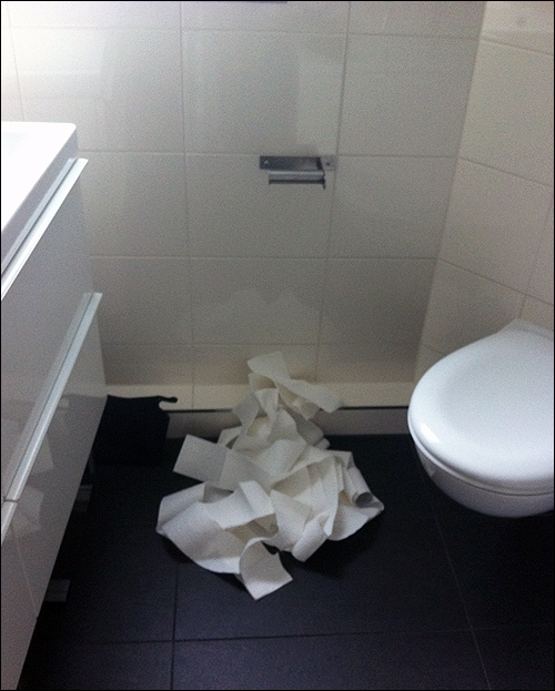 Kurz zu Hause im Gäste-WC erschrocken. Die Cabwoman hat dort ein Katzenbild aufgehängt. Sieht man nur durch den Spiegel, wenn die Tür geschlossen ist.